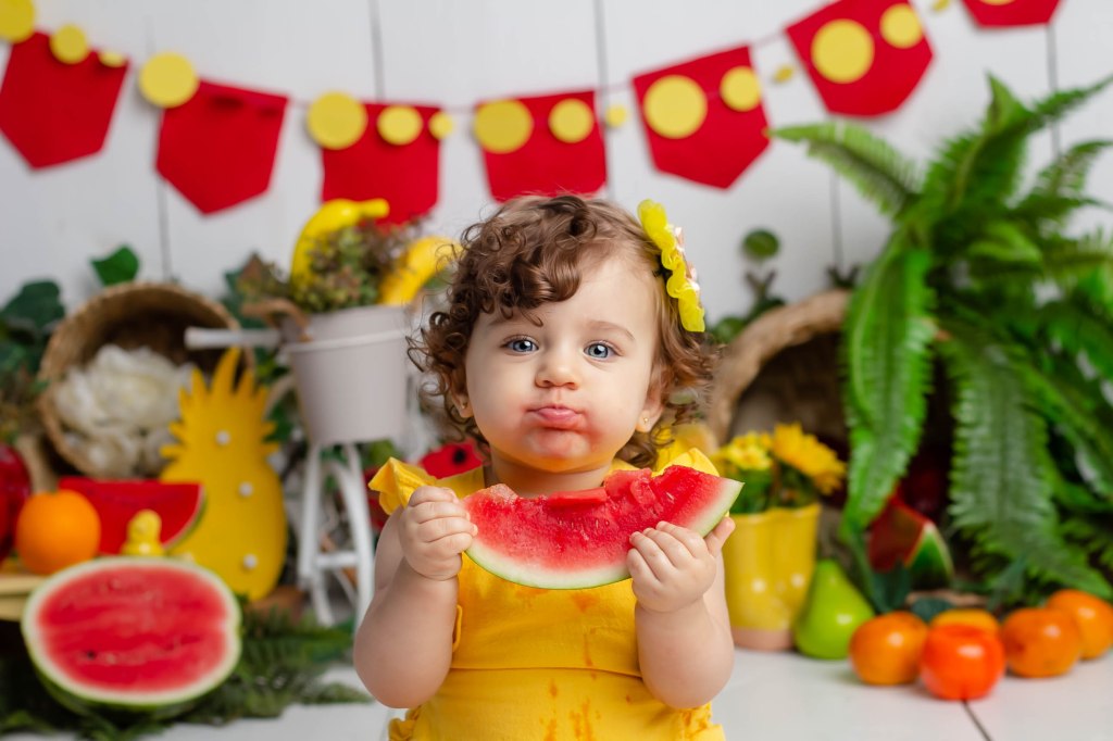 Para os pais que optam por não oferecer açúcar ao bebê ou desejam algo diferente do tradicional bolo, existem diversas alternativas criativas e afetivas para o ensaio. Entre as mais queridas estão as sessões com frutas frescas, como morangos, melancias ou uvas, que proporcionam ao bebê uma experiência sensorial deliciosa, cheia de cores e texturas naturais.